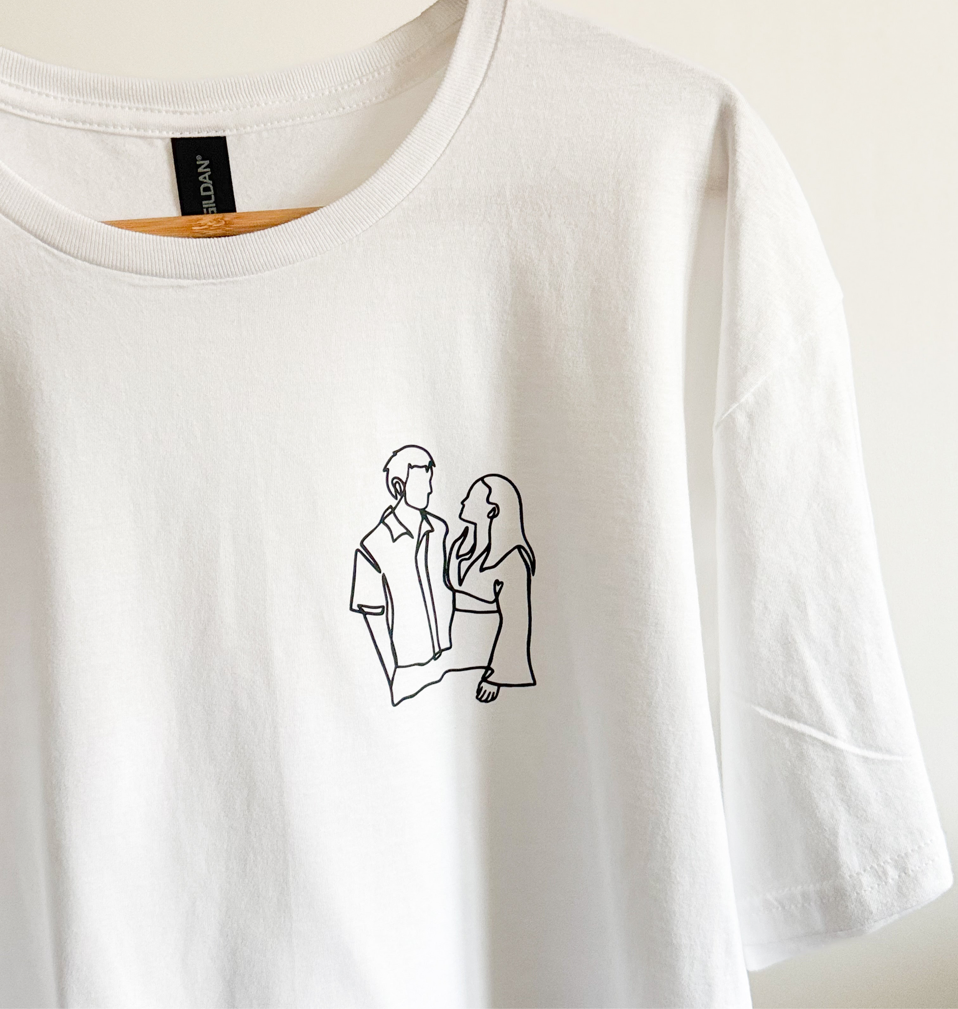 *Huomaa, että pienen 2 hahmon kuvassa on rajoituksia. Hahmojen tulee olla istumassa vierekkäin (lemmikit) tai lähekkäin esim. halaamassa (ihmiset). Esim. kahden lemmikin kasvokuvat tulee ottaa isona kuvana, joka tulee paidan keskelle, niitä ei saa tehtyä paidan sivuun pienempänä kuvana.