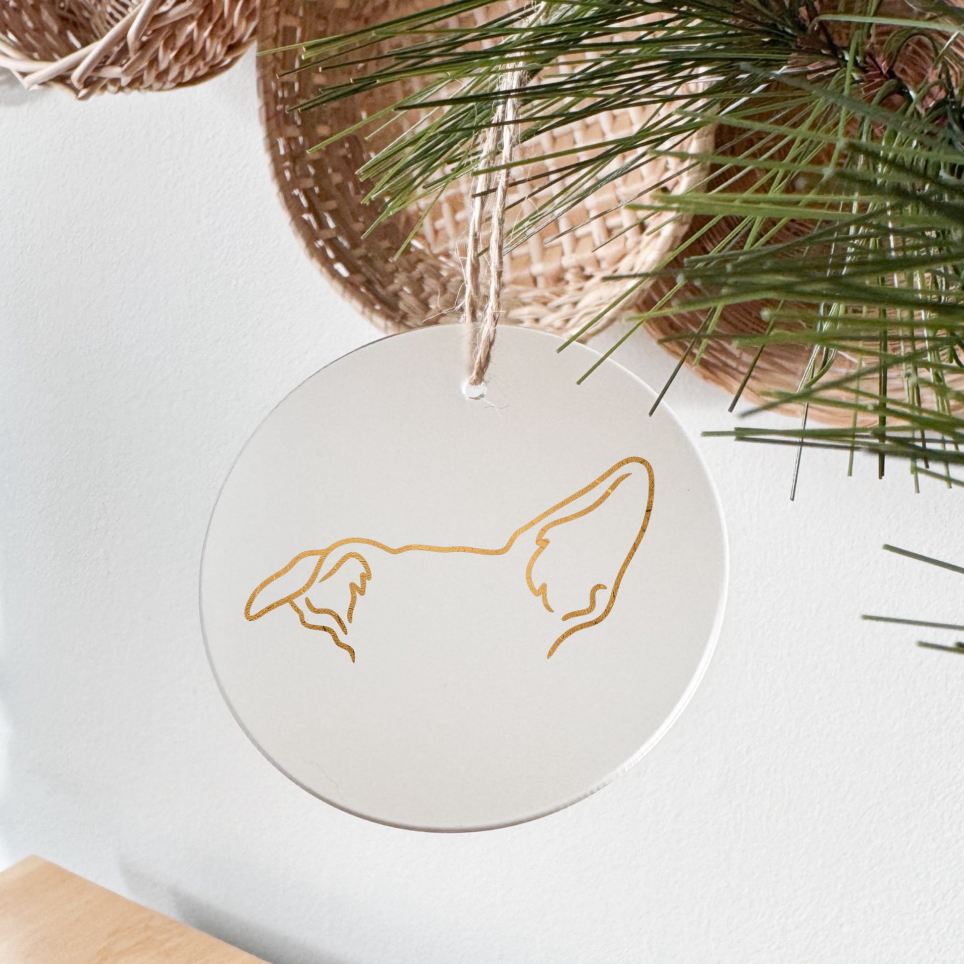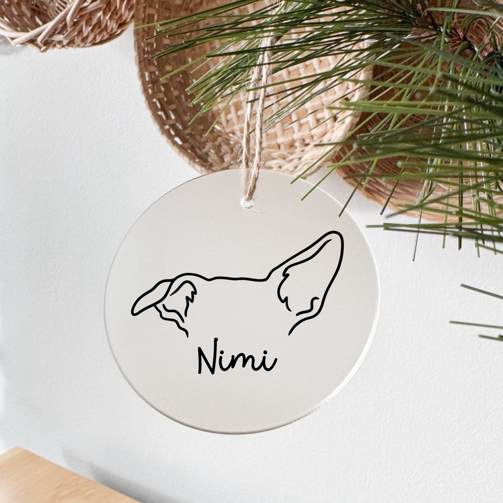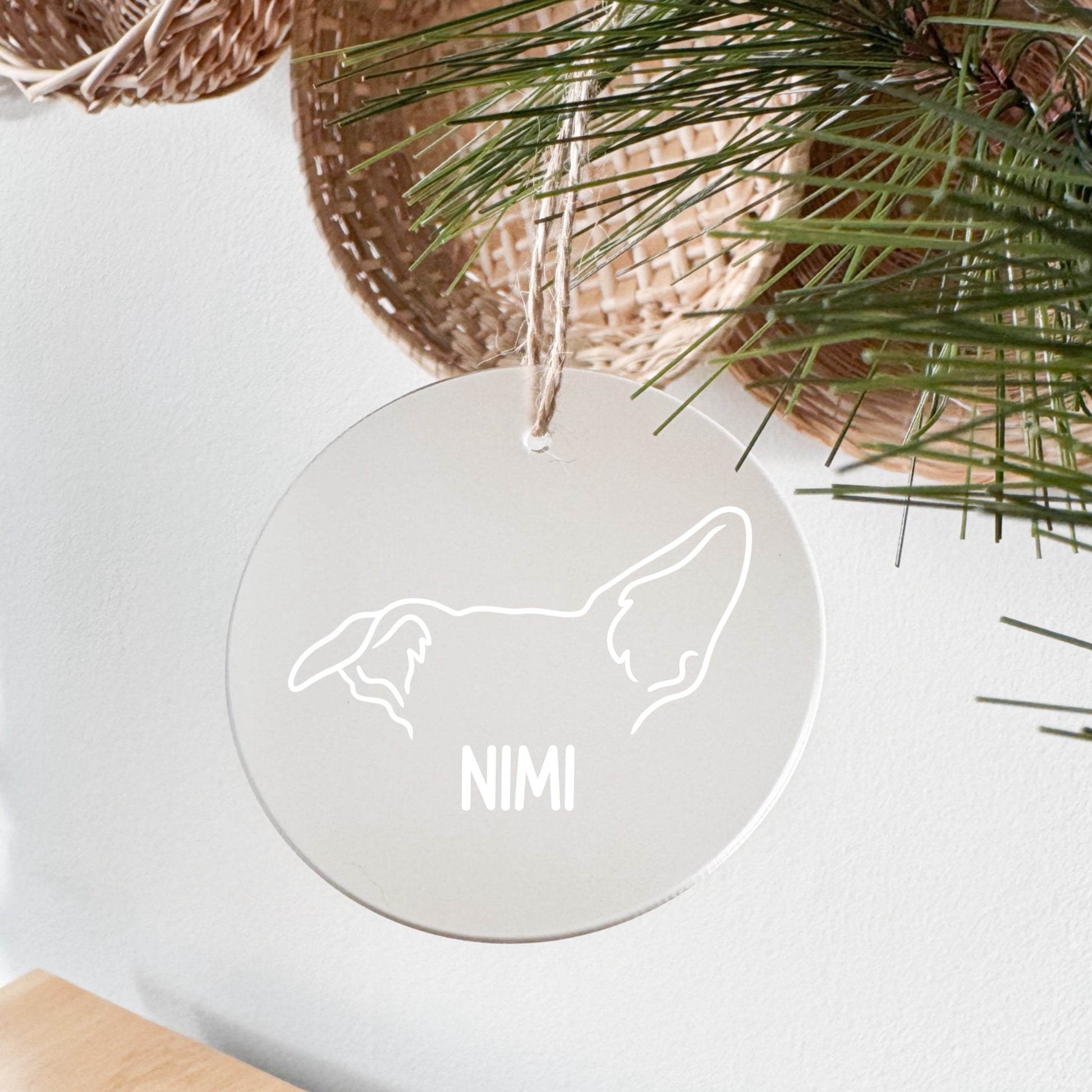 Akryylinen joulukoriste käsinpiirretyllä korvakuvituksella oman lemmikin korvista.