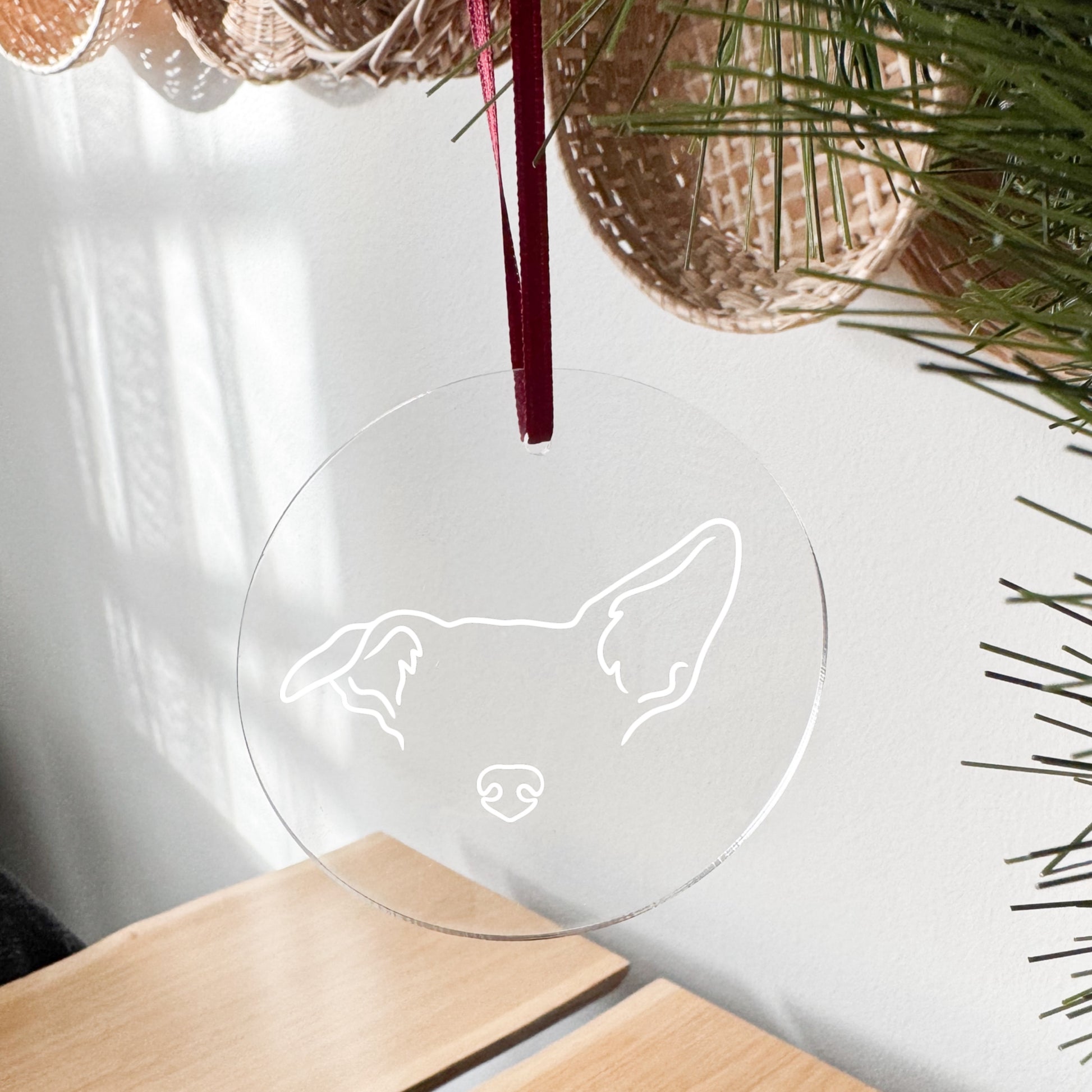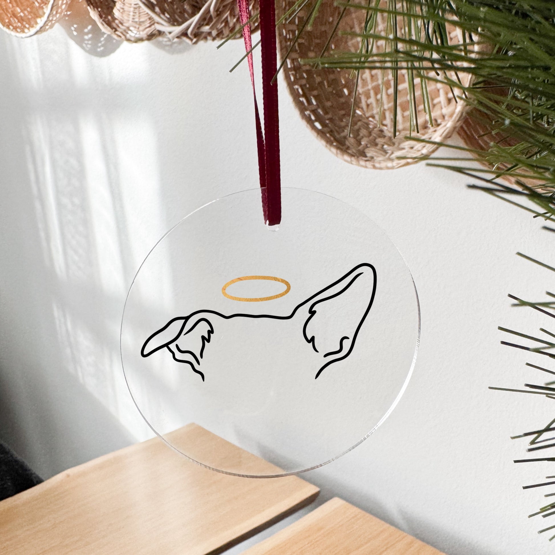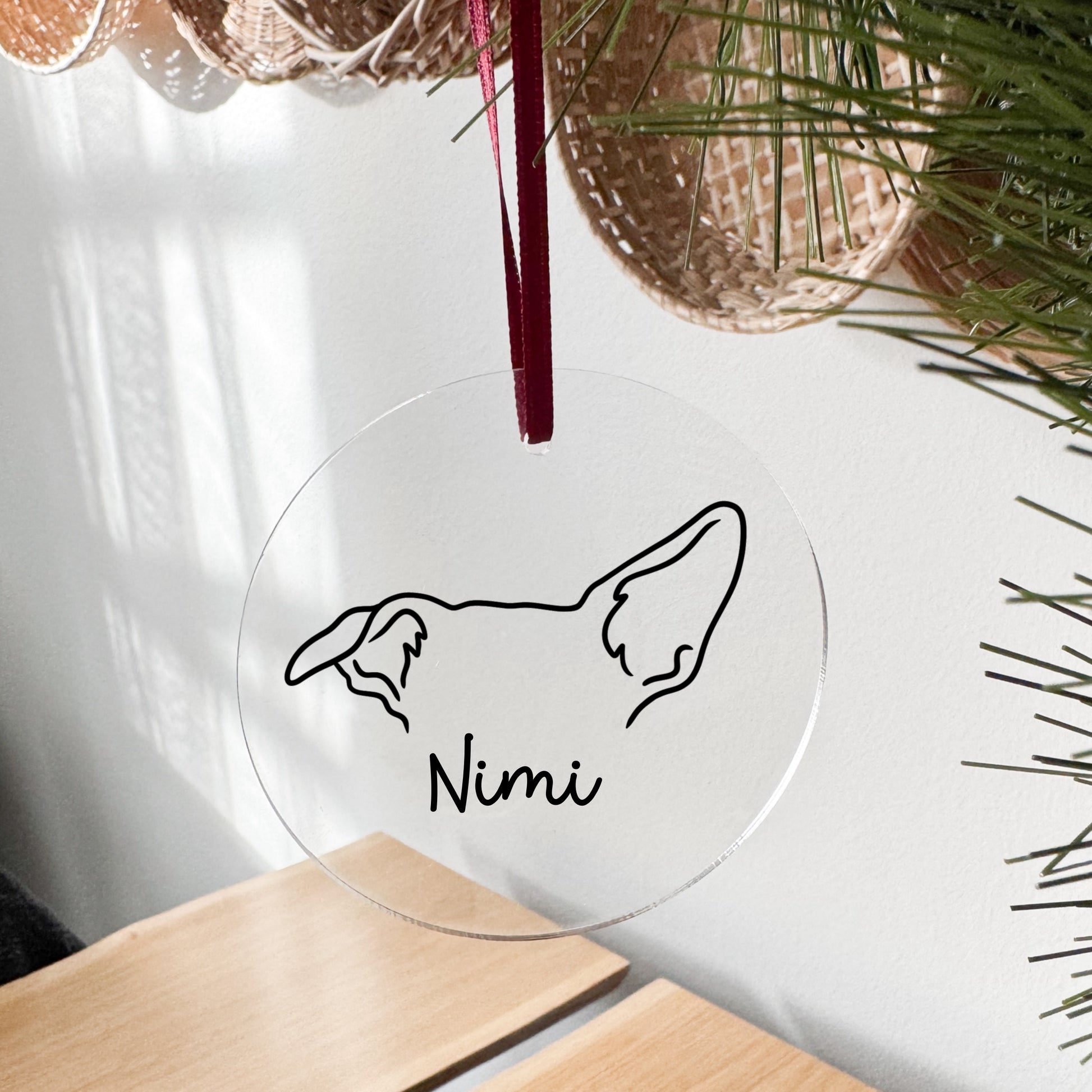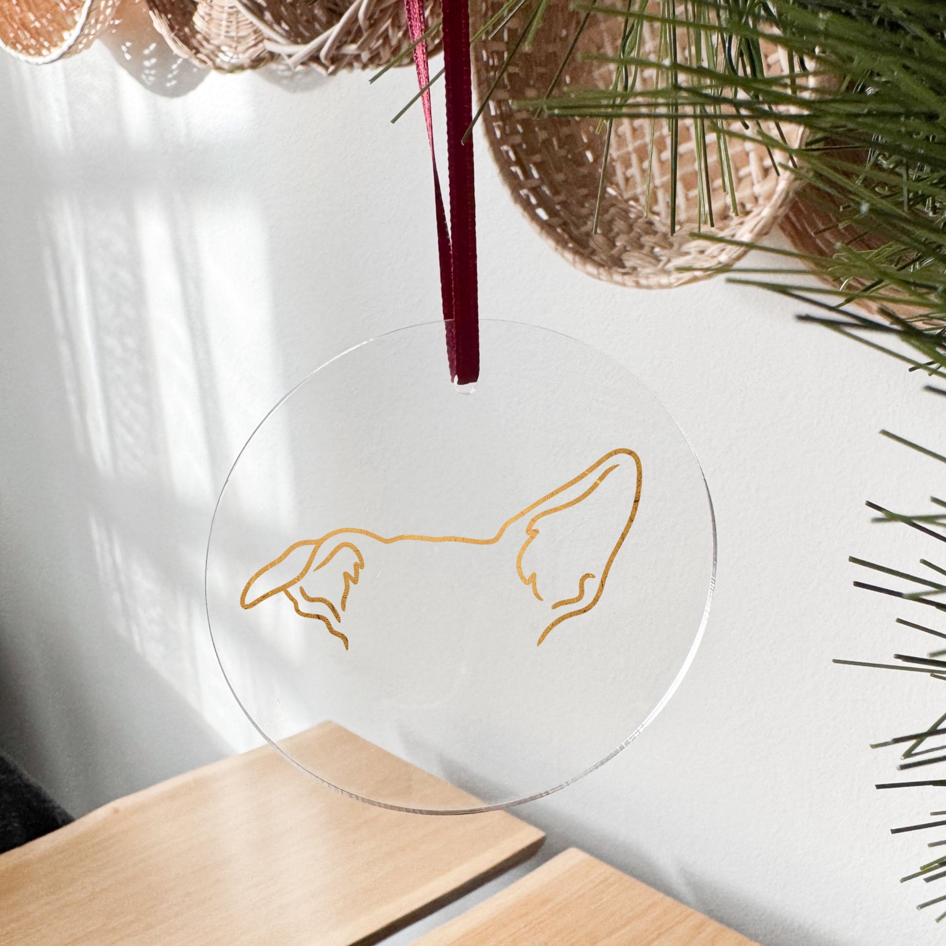 Akryylinen joulukoriste käsinpiirretyllä korvakuvituksella oman lemmikin korvista.