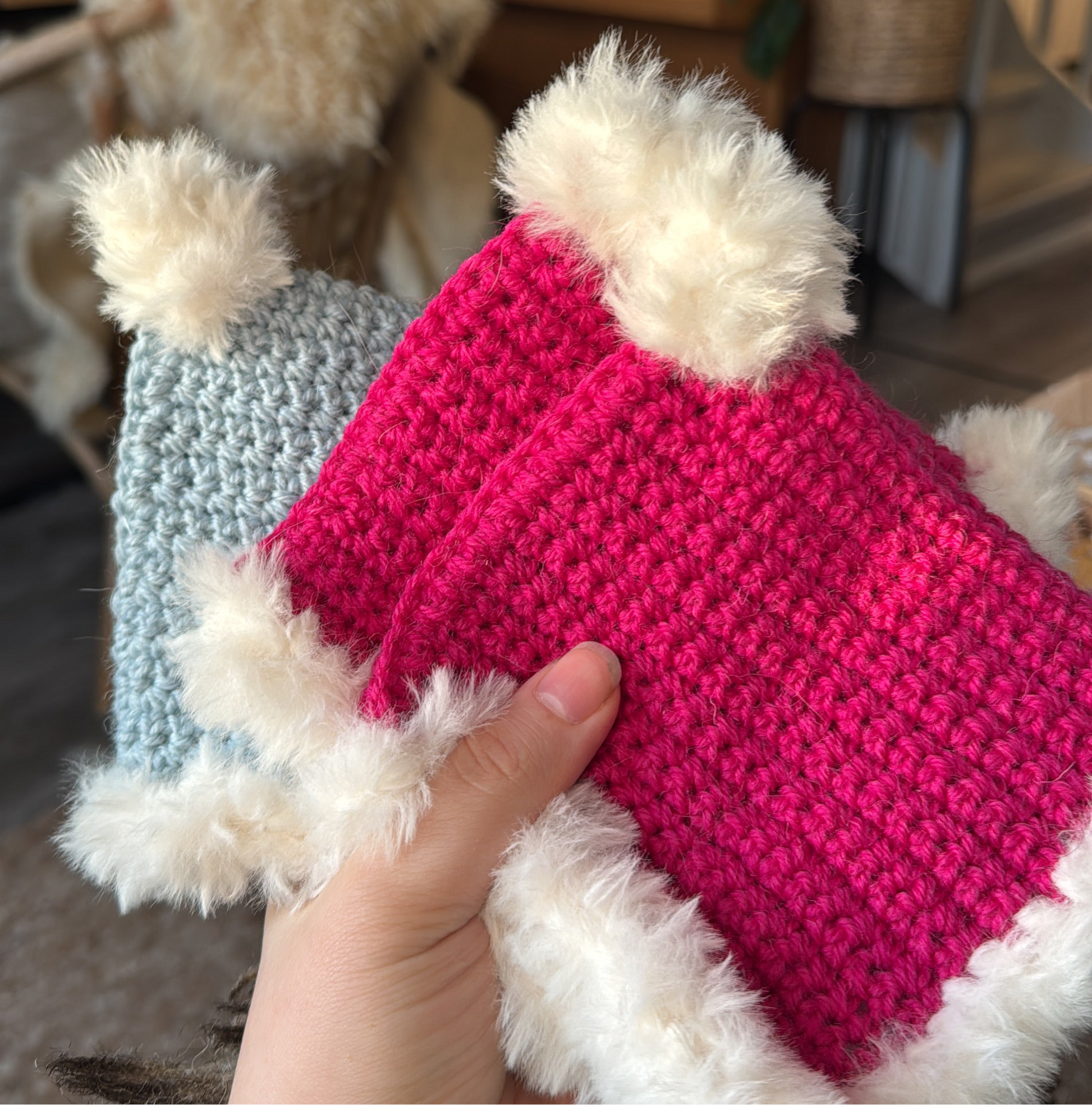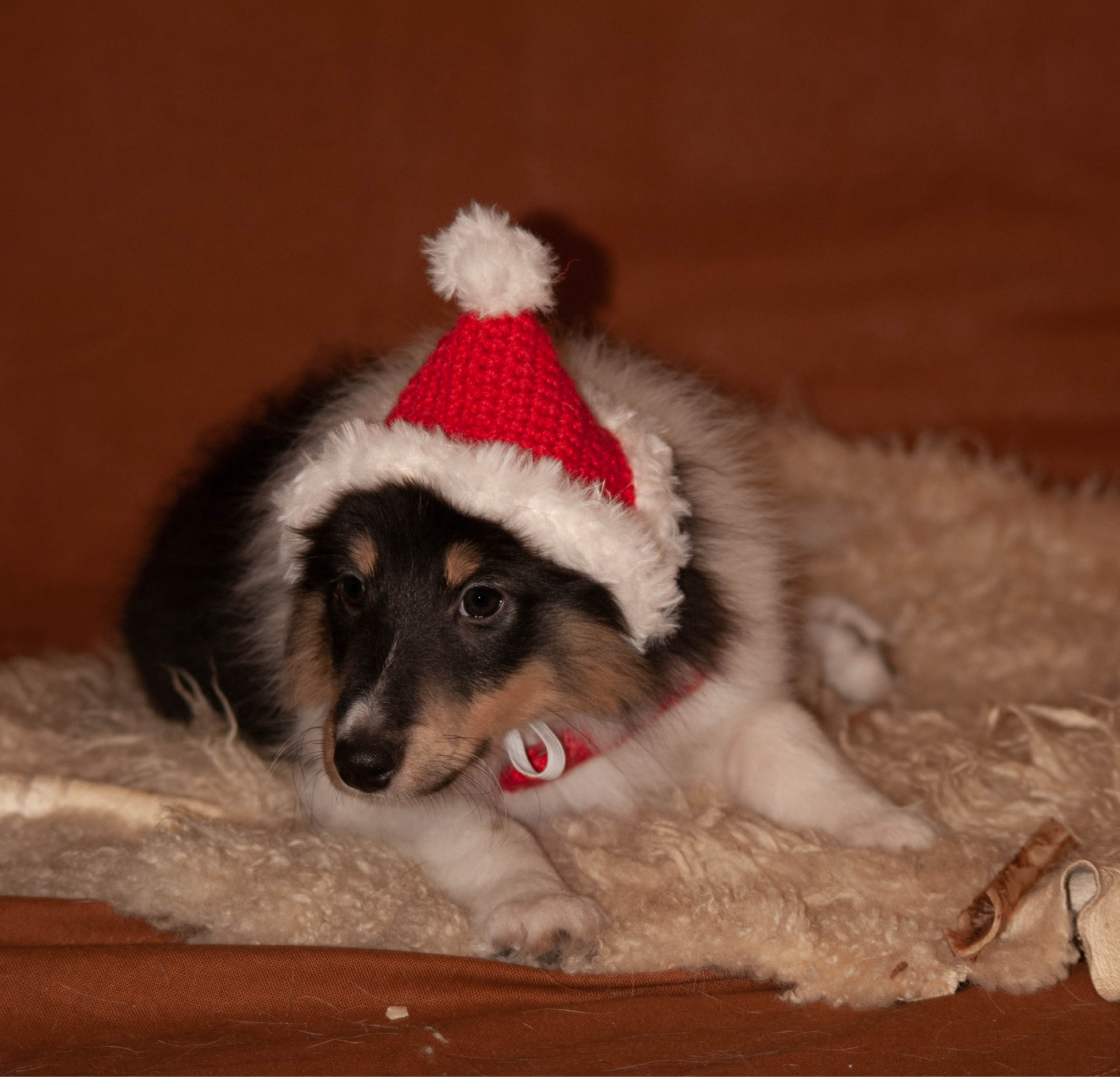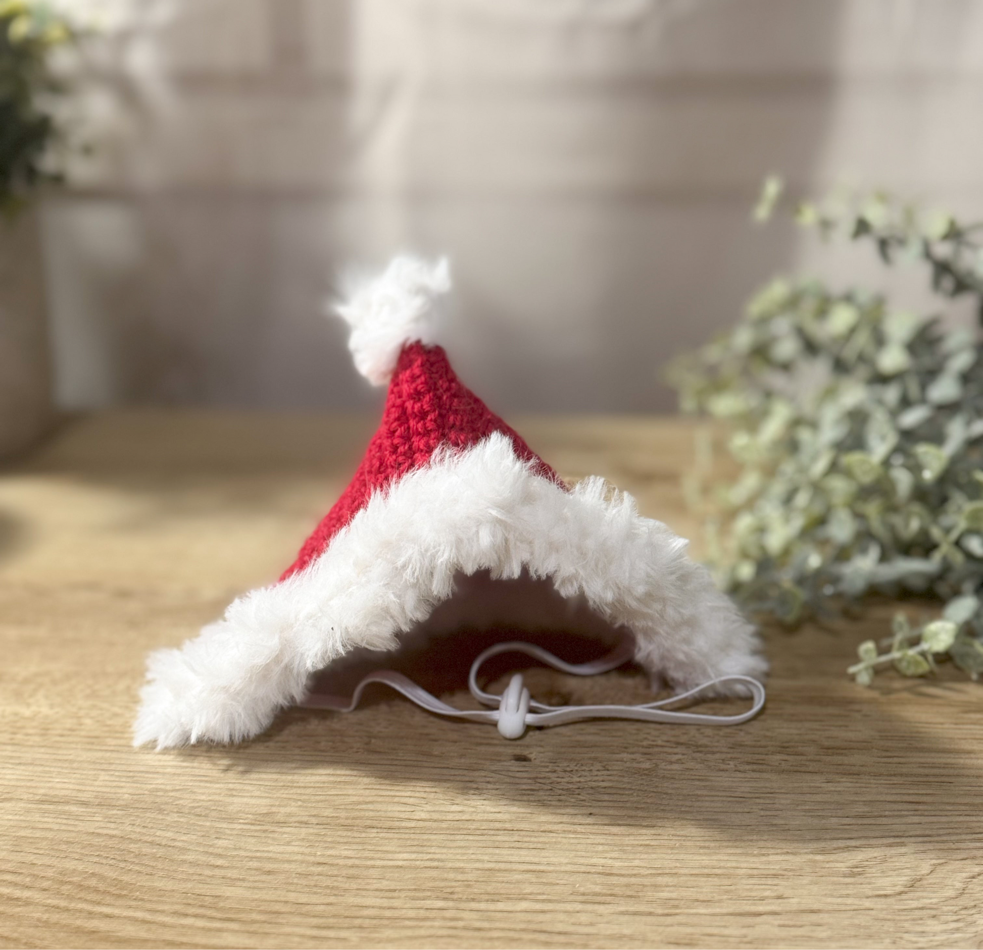 Virkattu koirien tonttulakki, jossa pehmoinen karvareunus sekä tupsu. Värillinen lanka 80 % villaa ja 20 % polyamidia. Valkoinen pörröinen lanka 100% polyesteriä. Kuminauha kiristysmahdollisuudella leuan alla.