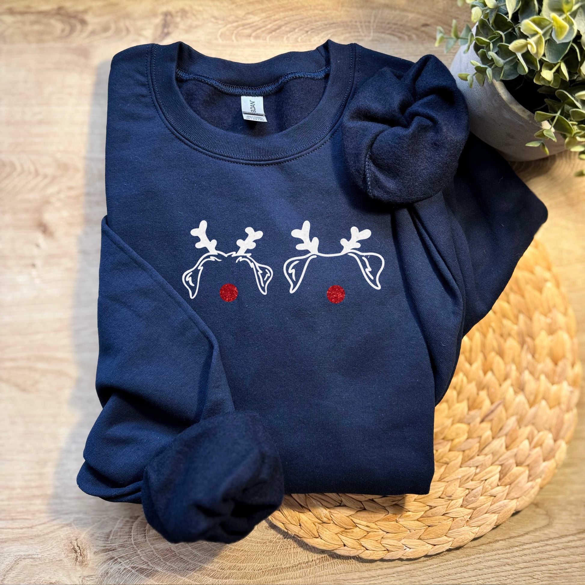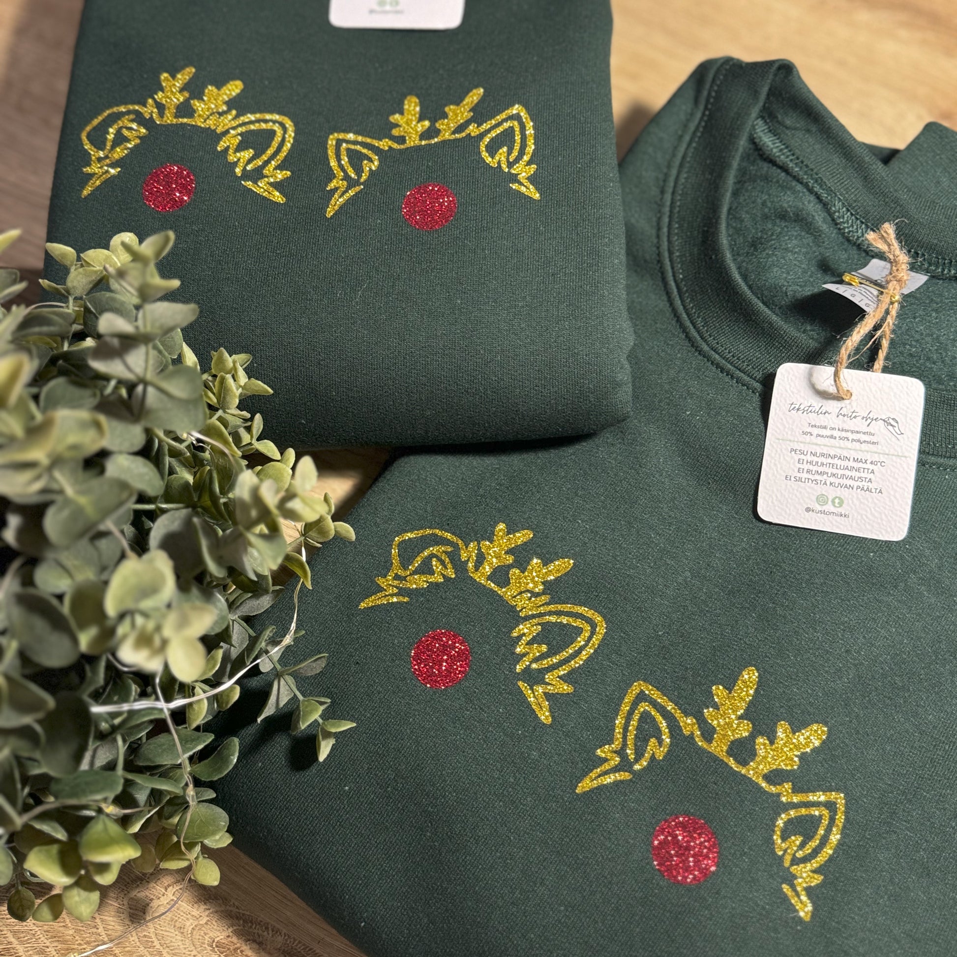 Unisex college oman lemmikin jouluisella glitter korvakuvituksella. Korvakuvituksessa lisäksi poronsarvet ja nenä.