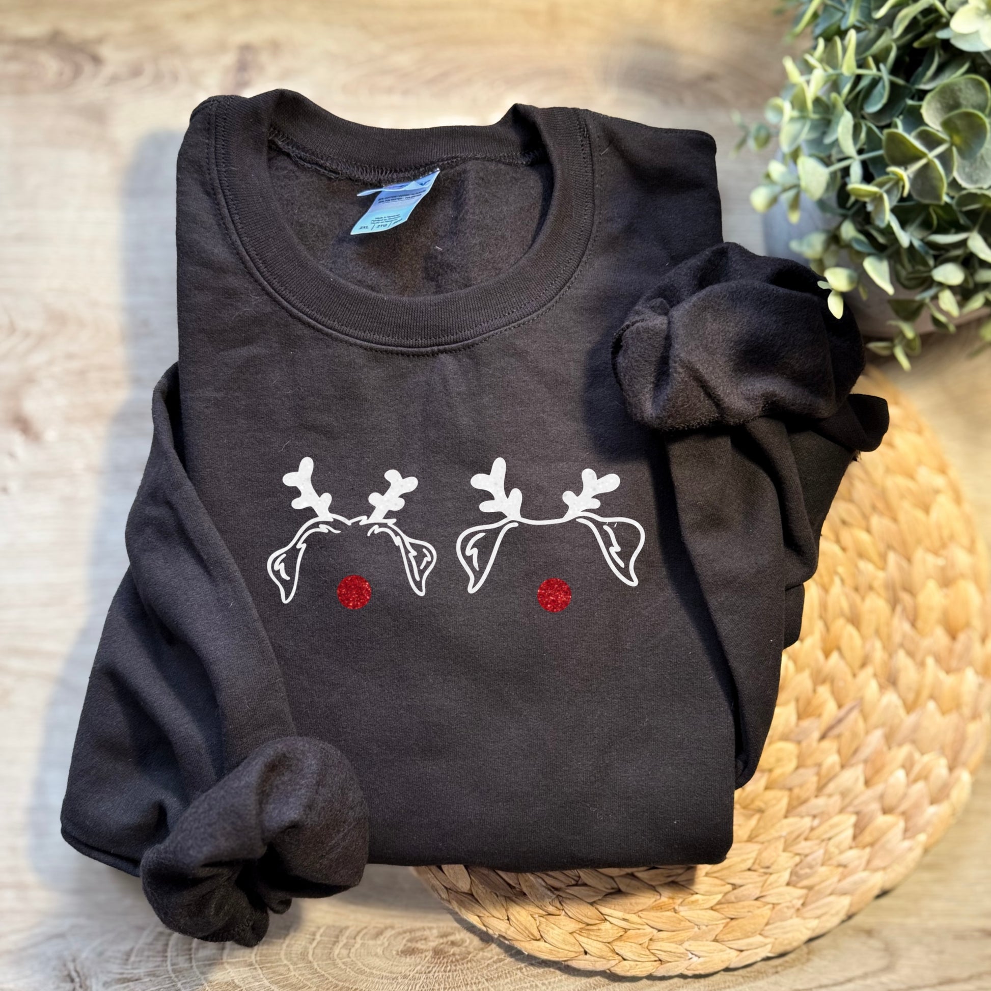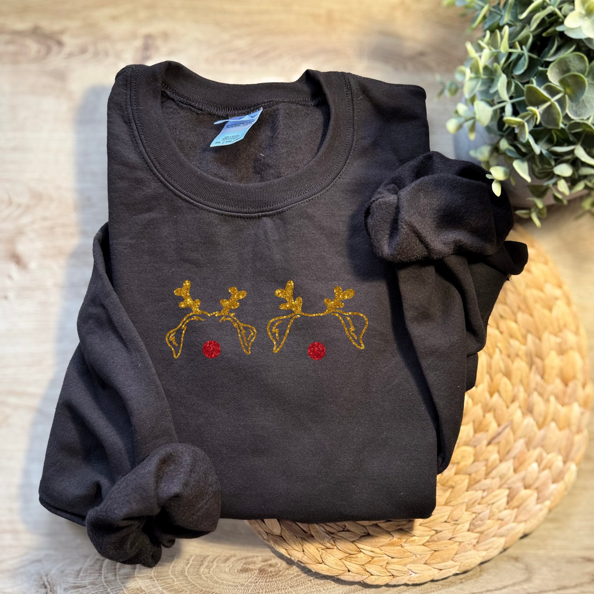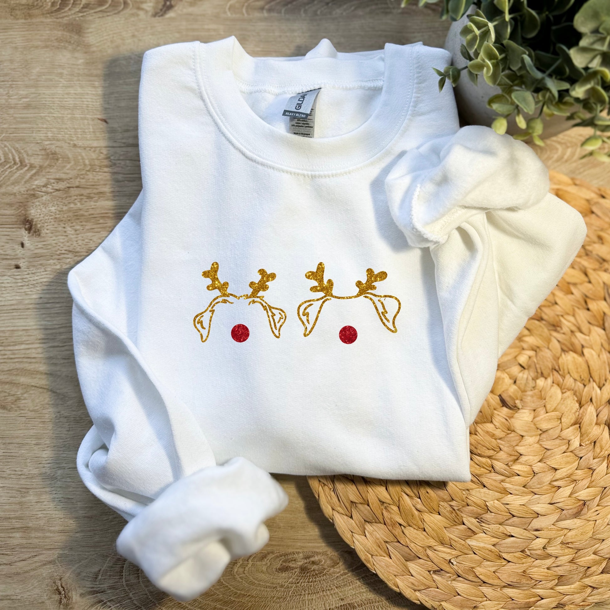 Nenä punaisesta glitteristä ja sarvet kultaisesta, valkoisesta tai hopeisesta glitteristä. Kirjaa haluttu korvien/sarvien väri ostoskorin "tilauksen lisätiedot" osioon.